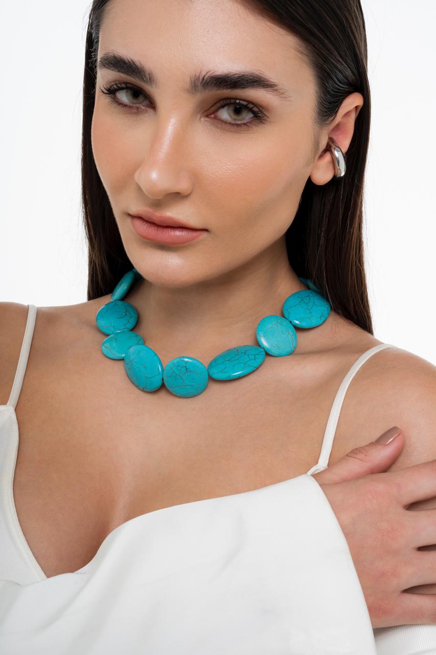 Colar de pedra natural turquesa com acabamentos banhados em ouro 18 K. Banho antialérgico, níquel free! Com verniz cataforético, que confere brilho e mais durabilidade a peça. Possui extensor que confere maior versatilidade a peça.