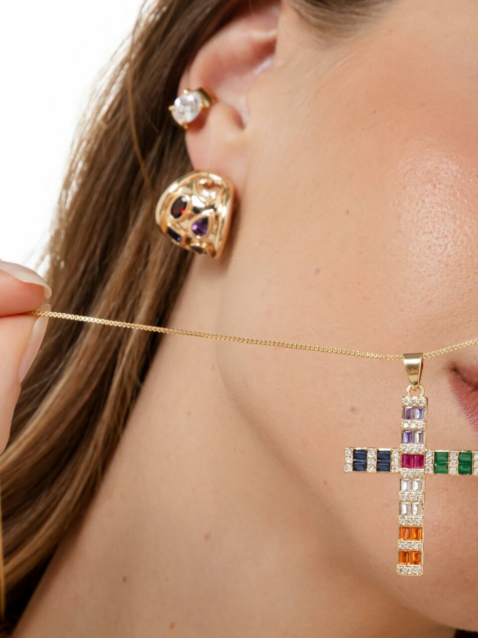 Corrente veneziana e pingente cravejado com zircônias coloridas banhado a ouro 18k. Banho antialérgico, sem níquel. Finalizado com verniz cataforético que confere muito mais brilho e durabilidade a peça.