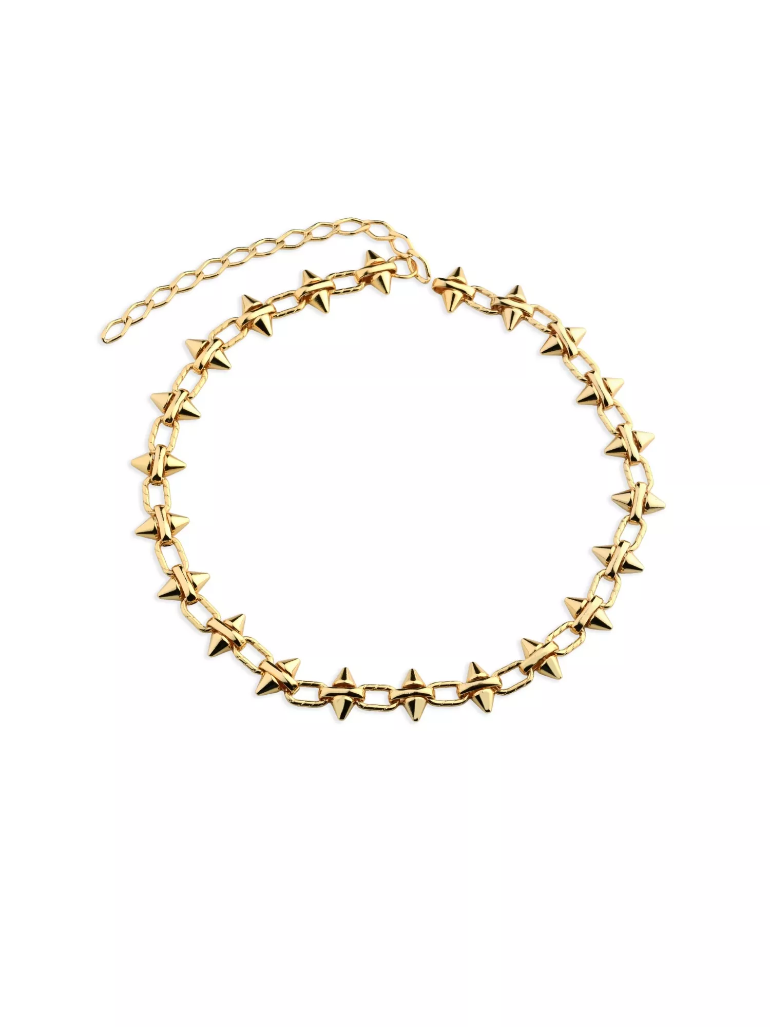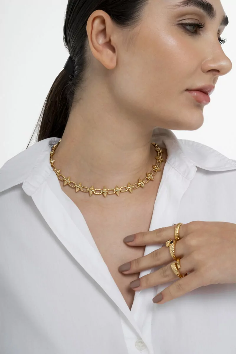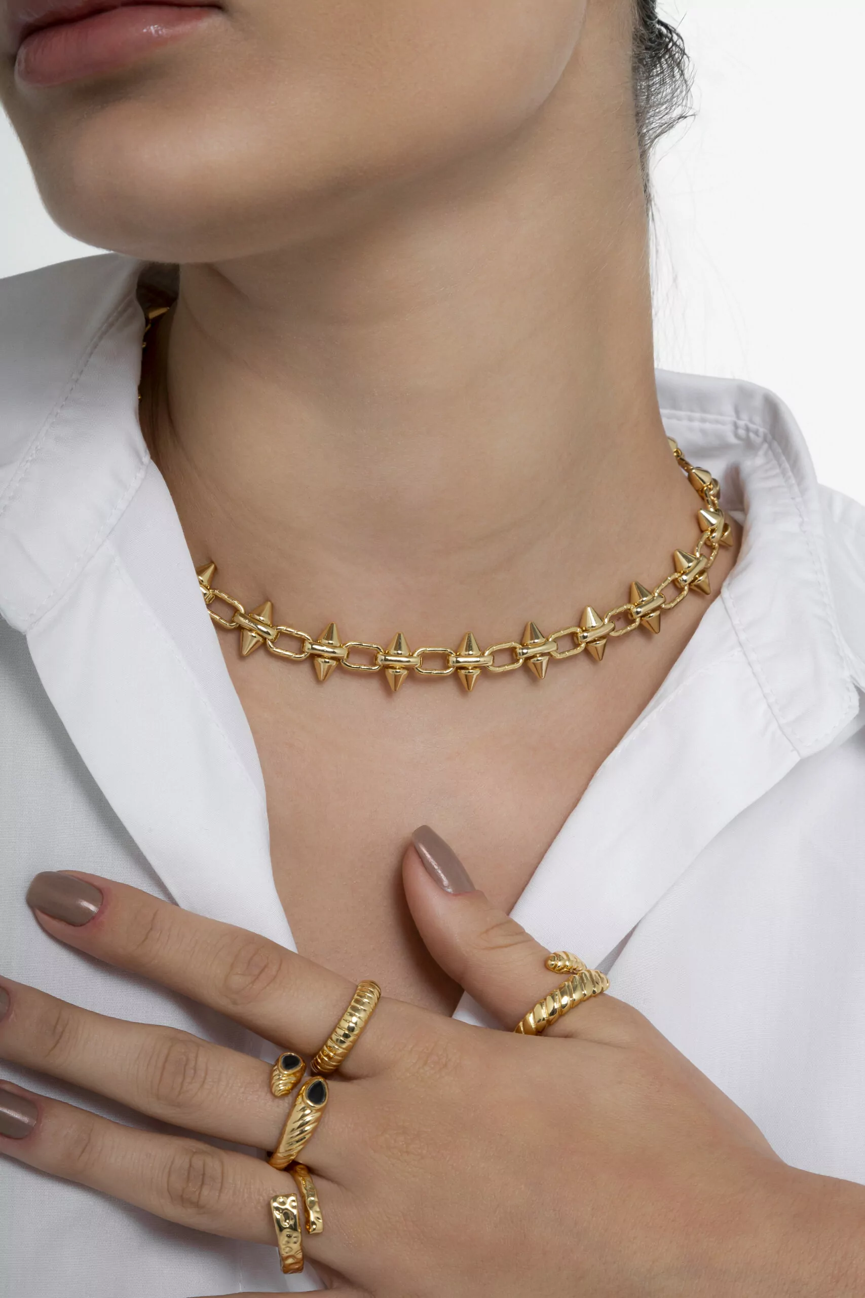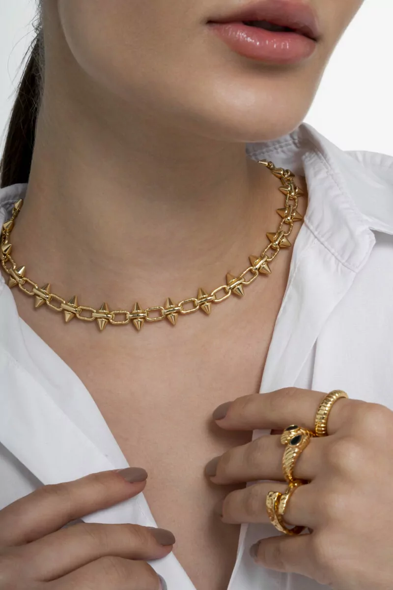 Colar de spikes banhado a ouro 18k com fecho quadrado especial. Acabamento em verniz cataforético que confere muito mais brilho e durabilidade a sua jóia. Banho antialérgico, níquel free. Colar com 35 cm de comprimento mais 5 cm de extensor.