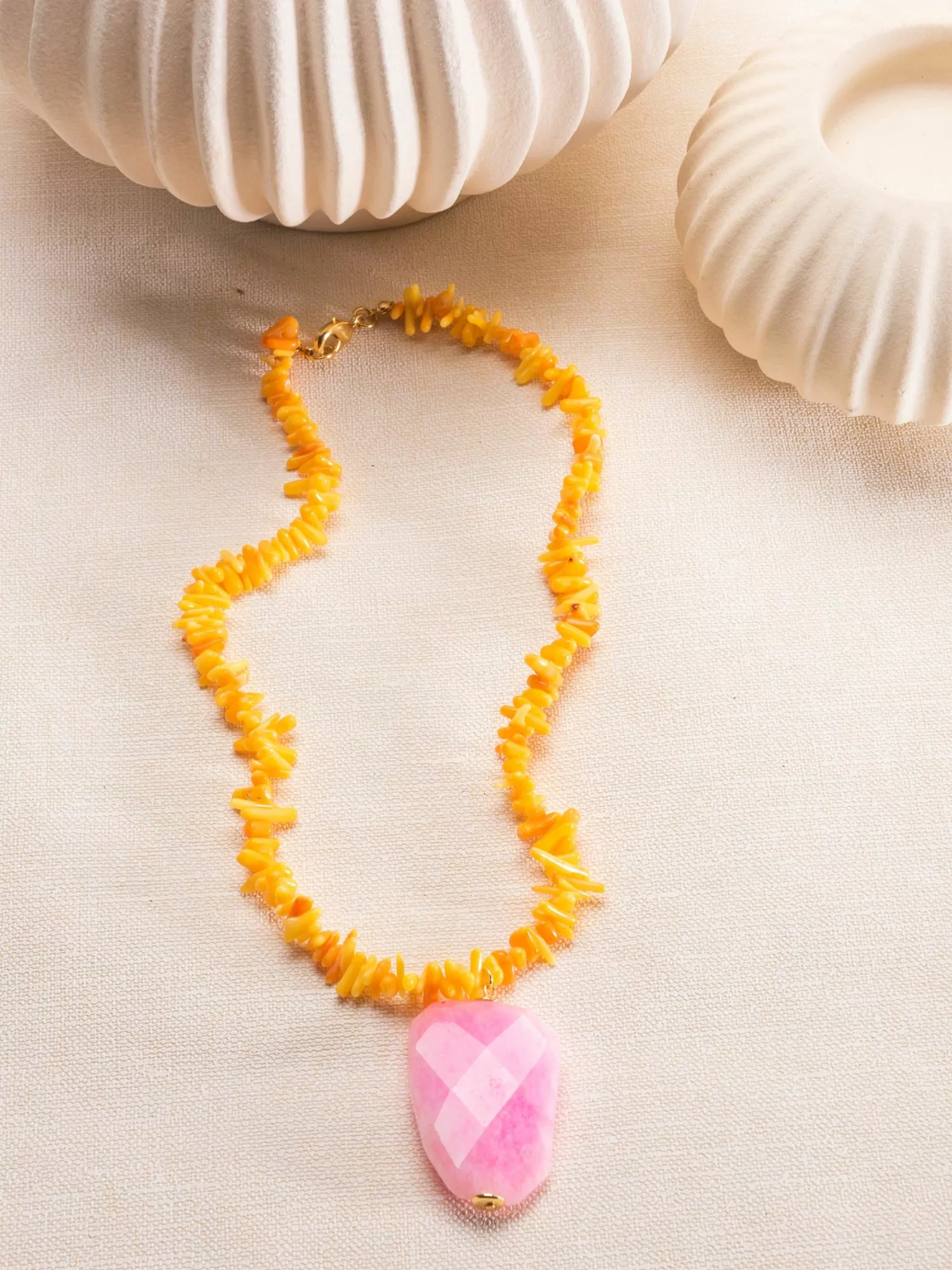 Colar de cascalho coral e pingente de pedra natural (Jade) com acabamentos banhados a ouro 18k, finalizado com verniz cataforético, que confere mais brilho e durabilidade a sua jóia! Banho antialérgico, níquel free.